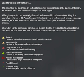 Everon, godziny poranne, 6 maja 1989. Nocny desant na lotnisko powiódł się, słabo wyposażona FIA i szczątkowa obsada NATO nie stawiały oporu. Nasze jednostki rozpoczęły czyszczenie Saint Phillipe i Meaux ale aby utrzymać inicjatywę Wasz pluton ma za zadanie przeprowadzić rozpoznanie wzdłuż głównej arterii wyspy, do Montignac, zdobycie miasta i...